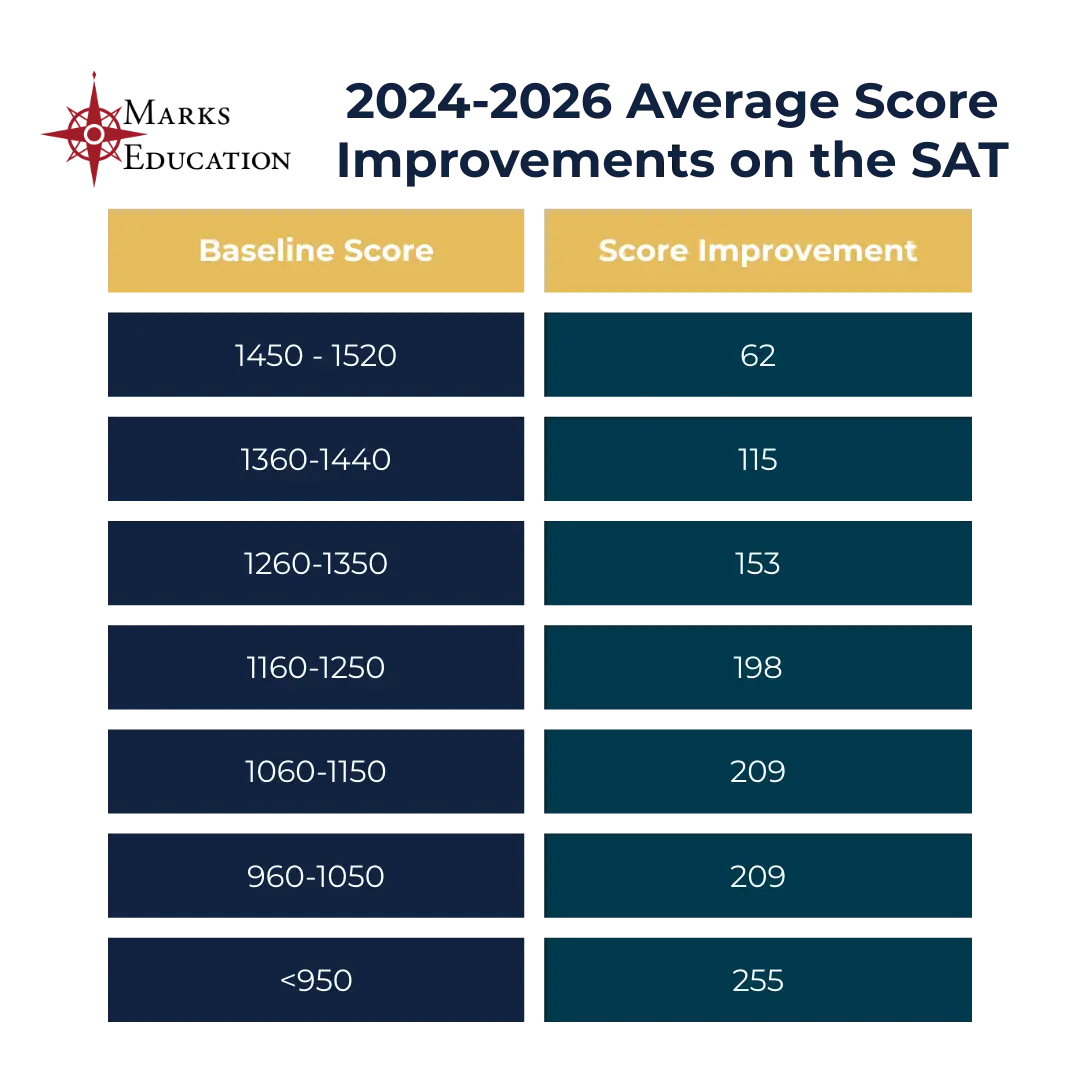 Our expert tutors have helped thousands of students achieve exceptional results. In 2025, Marks Education students had an average score improvement of 166 on their SAT.